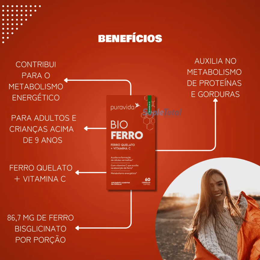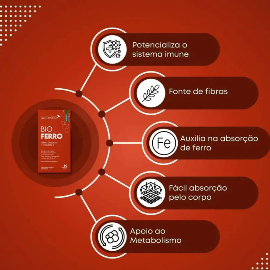 Na incessante busca pela excelência em nutriçãoe bem-estar, a Puravida apresenta o Bio Ferro:uma combinação eficaz entre ferro bisglicinatoe vitamina C, essencial para a absorção de ferro.