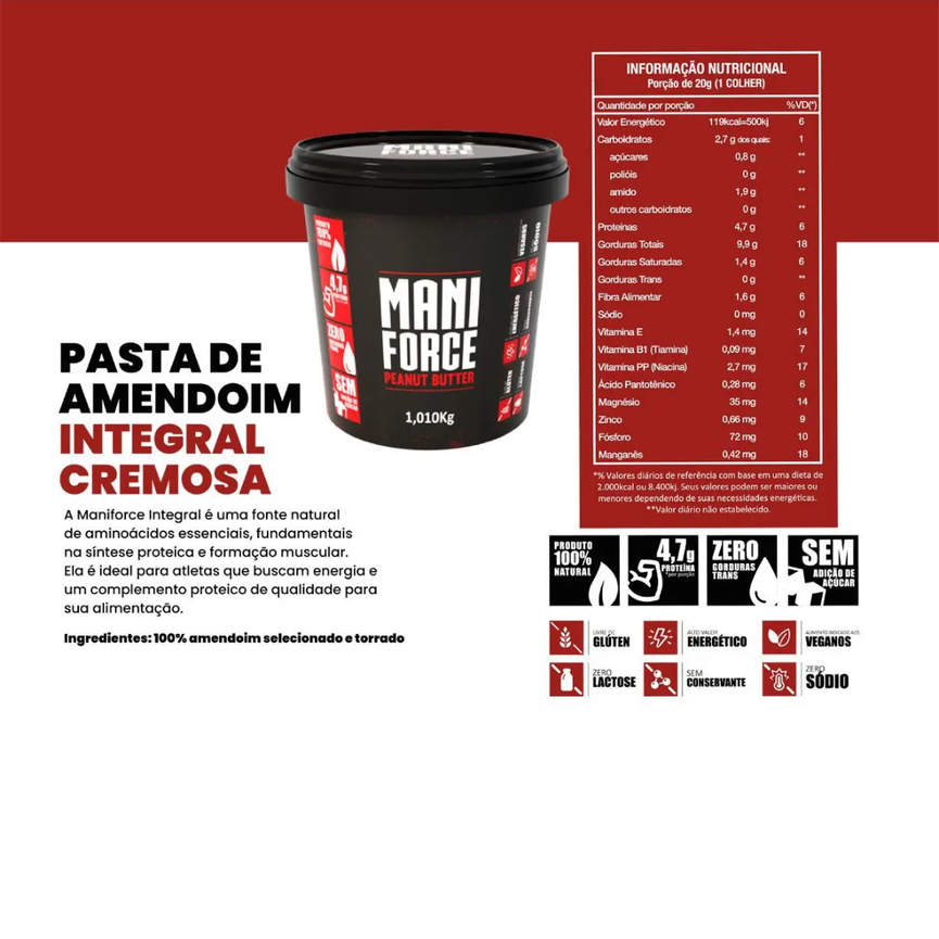 Maniforce Integral é uma fonte natural de aminoácidos essenciais, fundamentais na síntese proteica e formação muscular. Ideal para atletas que buscam energia e um complemento proteico de qualidade para sua alimentação.